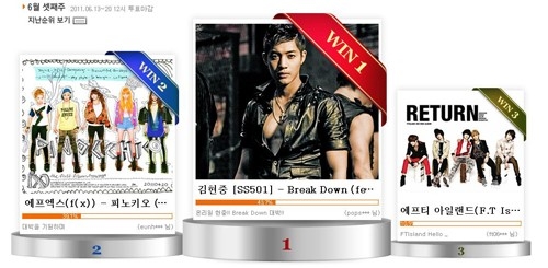 에프엑스의 저력도 만만치 않다. 신곡 ‘핫 섬머(Hot Summer)’를 발표하고 다시 한 번 인기몰이에 나선 에프엑스는 지난주 차트에 이어 2위에 올랐다. 6월 첫째주 종합 1위를 차지했던 에프엑스는 1위를 두고 지난주 내내 김현중과 치열한 접전을 벌였다. 그러나 종합 집계에서 39.1%의 지지를 얻는 데 그쳐 정상 탈환에 고배를 마셨다.