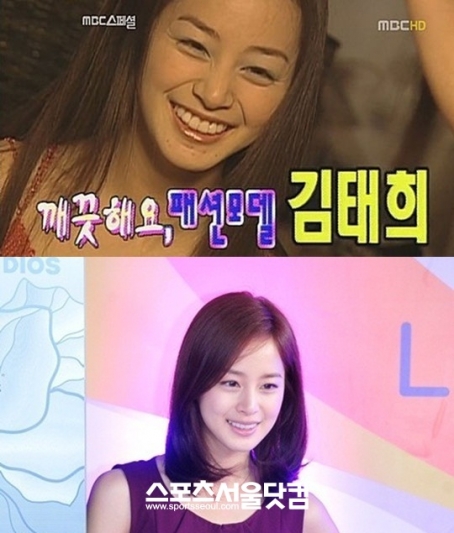 화장법 때문일까. 김태희의 과거 사진은 현재와 판이하다. 두꺼운 화장, 눈가의 주름 등이 지금보다 훨씬 나이 들어 보인다.