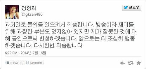 김영희는 트위터에서 “과거 일로 물의를 일으켜서 죄송합니다. 방송이라 재미를 위해 과장한 부분도 없지 않아 있지만 제가 잘못한 것에 대해 공인으로서 반성하겠습니다. 앞으로 더 조심히 행동하겠습니다. 다시 한번 죄송합니다”라고 적었다.