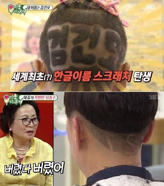 한편 가수 김건모는 ‘한글 이름’ 스크래치로 자기애를 과시했다. 지난 11일 방송된 SBS ‘미운우리새끼’(이하 ‘미우새’)에서 김건모가 뒤통수에 양각으로 선명하게 ‘김건모’를 새기자, 그의 어머니는 경악했다. 김건모는 “건널목을 건널 때는 맨 앞에 서야겠다“며 만족스러워 했다.
